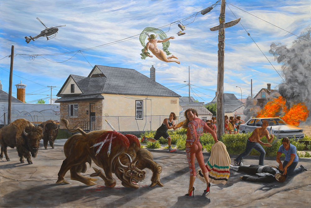 women) in North American Indigenous societies, many of them matrilineal. ” In this painting, Miss Chief takes over the matador`s role as bison return